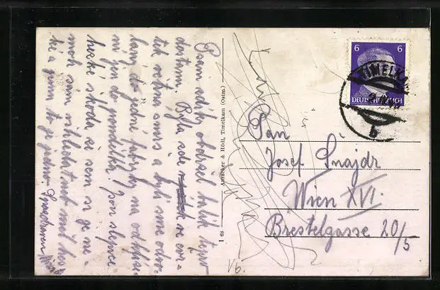 Personenbezogene Daten auf der Rückseite der Karte wurden durch blauen Textmarker unkenntlich gemacht. Die blauen Stellen sind auf die Vorderseite durchgeweicht und wirken sich negativ auf das Postkartenfoto aus