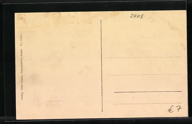 Personenbezogene Daten auf der Rückseite der Karte wurden durch blauen Textmarker unkenntlich gemacht. Die blauen Stellen sind auf die Vorderseite durchgeweicht und wirken sich negativ auf das Postkartenfoto aus