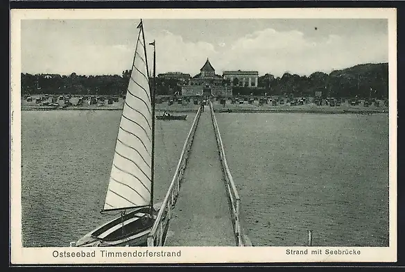 AK Timmendorferstrand /Ostsee, Strand mit Seebrücke und Segelboot