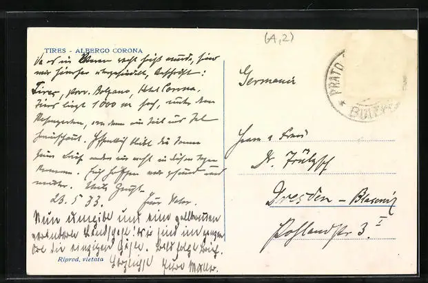 Personenbezogene Daten auf der Rückseite der Karte wurden durch blauen Textmarker unkenntlich gemacht. Die blauen Stellen sind auf die Vorderseite durchgeweicht und wirken sich negativ auf das Postkartenfoto aus