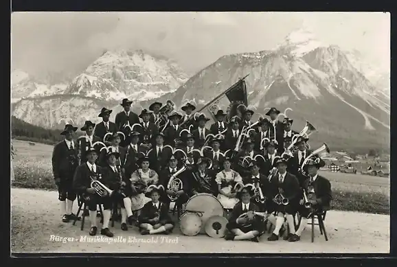 AK Tirol, Trachtenkapelle Bürger-Musikkapelle Ehrwald mit Instrumenten u. Fahne