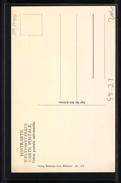 Personenbezogene Daten auf der Rückseite der Karte wurden durch blauen Textmarker unkenntlich gemacht. Die blauen Stellen sind auf die Vorderseite durchgeweicht und wirken sich negativ auf das Postkartenfoto aus