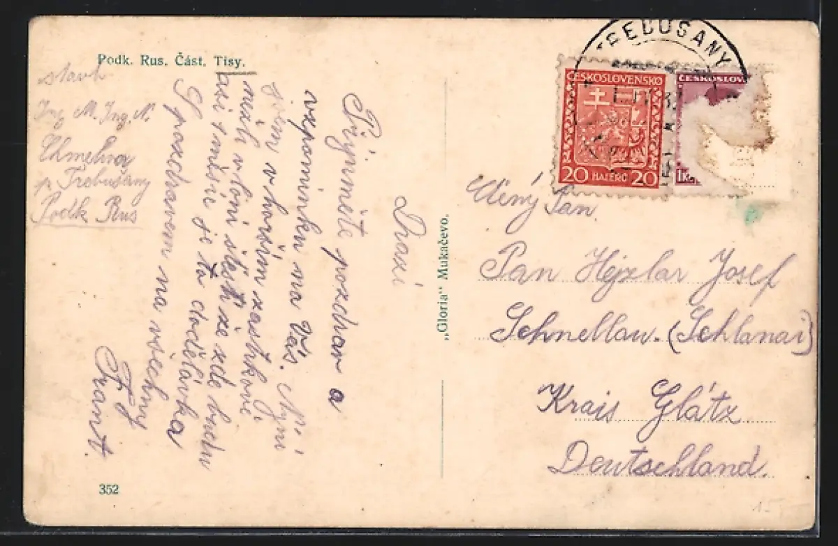 Personenbezogene Daten auf der Rückseite der Karte wurden durch blauen Textmarker unkenntlich gemacht. Die blauen Stellen sind auf die Vorderseite durchgeweicht und wirken sich negativ auf das Postkartenfoto aus