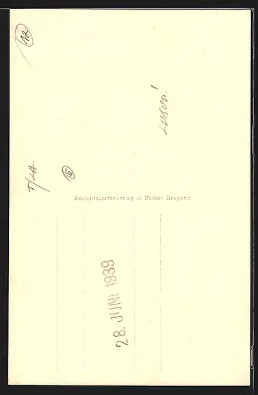 Personenbezogene Daten auf der Rückseite der Karte wurden durch blauen Textmarker unkenntlich gemacht. Die blauen Stellen sind auf die Vorderseite durchgeweicht und wirken sich negativ auf das Postkartenfoto aus