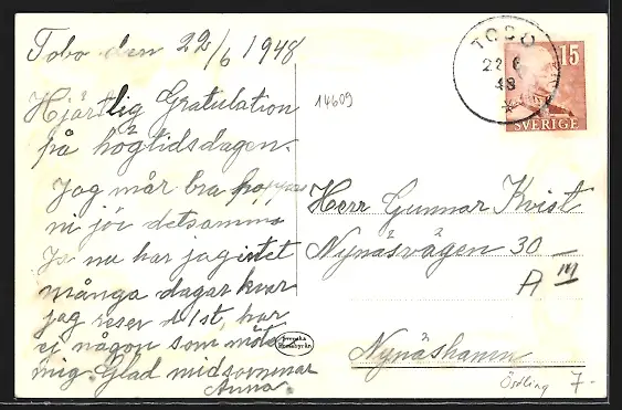 gelaufen 1948, rückseitig Klebe- und Papierreste, guter Zustand