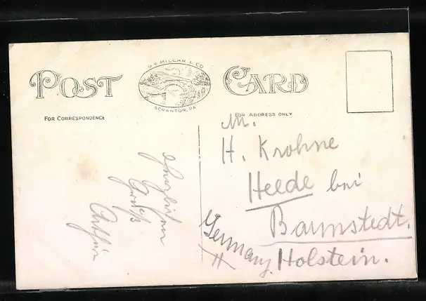Personenbezogene Daten auf der Rückseite der Karte wurden durch blauen Textmarker unkenntlich gemacht. Die blauen Stellen sind auf die Vorderseite durchgeweicht und wirken sich negativ auf das Postkartenfoto aus