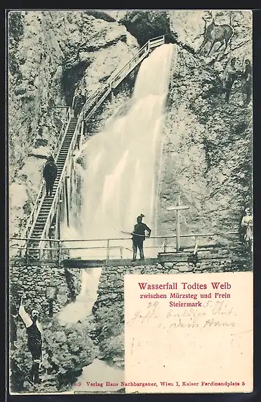 AK Todtes Weib, Wanderer am Wasserfall