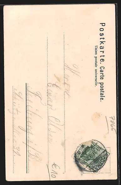 Personenbezogene Daten auf der Rückseite der Karte wurden durch blauen Textmarker unkenntlich gemacht. Die blauen Stellen sind auf die Vorderseite durchgeweicht und wirken sich negativ auf das Postkartenfoto aus