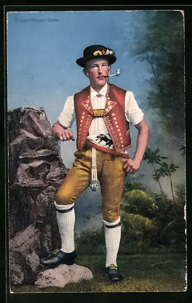 AK Toggenburger Senn mit Pfeife in Tracht vor einer Gebirgskulisse