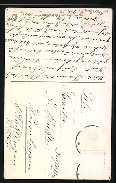 Personenbezogene Daten auf der Rückseite der Karte wurden durch blauen Textmarker unkenntlich gemacht. Die blauen Stellen sind auf die Vorderseite durchgeweicht und wirken sich negativ auf das Postkartenfoto aus