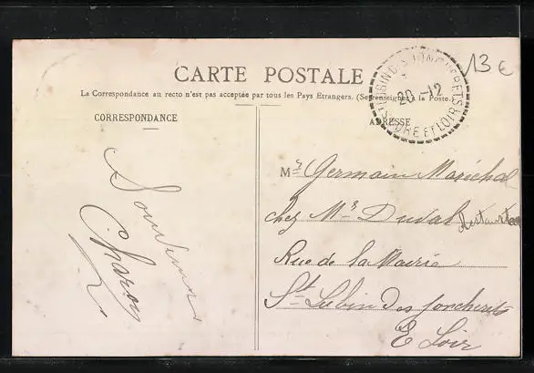 Personenbezogene Daten auf der Rückseite der Karte wurden durch blauen Textmarker unkenntlich gemacht. Die blauen Stellen sind auf die Vorderseite durchgeweicht und wirken sich negativ auf das Postkartenfoto aus