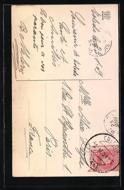 Personenbezogene Daten auf der Rückseite der Karte wurden durch blauen Textmarker unkenntlich gemacht. Die blauen Stellen sind auf die Vorderseite durchgeweicht und wirken sich negativ auf das Postkartenfoto aus