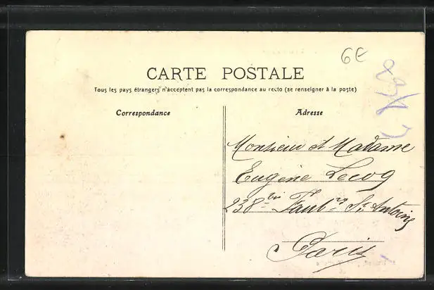 Personenbezogene Daten auf der Rückseite der Karte wurden durch blauen Textmarker unkenntlich gemacht. Die blauen Stellen sind auf die Vorderseite durchgeweicht und wirken sich negativ auf das Postkartenfoto aus
