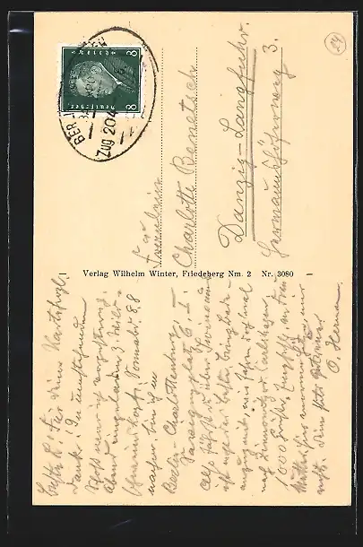 Personenbezogene Daten auf der Rückseite der Karte wurden durch blauen Textmarker unkenntlich gemacht. Die blauen Stellen sind auf die Vorderseite durchgeweicht und wirken sich negativ auf das Postkartenfoto aus