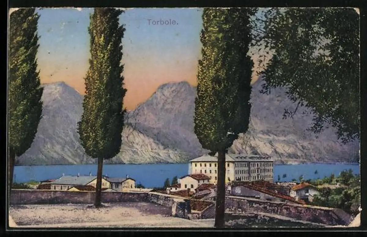 AK Torbole, Ortsansicht mit Wasser- und Bergblick