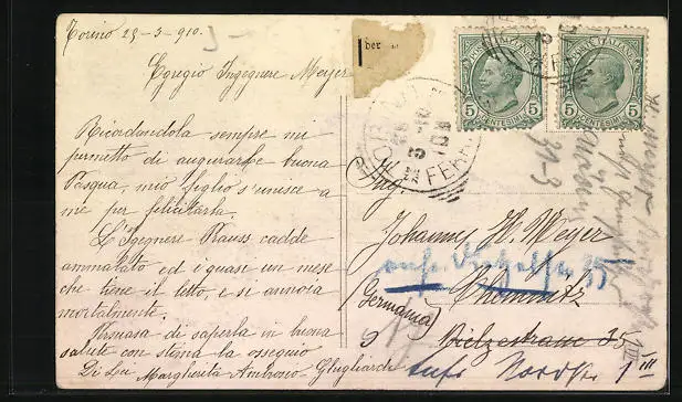 Personenbezogene Daten auf der Rückseite der Karte wurden durch blauen Textmarker unkenntlich gemacht. Die blauen Stellen sind auf die Vorderseite durchgeweicht und wirken sich negativ auf das Postkartenfoto aus