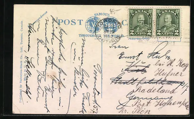 Personenbezogene Daten auf der Rückseite der Karte wurden durch blauen Textmarker unkenntlich gemacht. Die blauen Stellen sind auf die Vorderseite durchgeweicht und wirken sich negativ auf das Postkartenfoto aus
