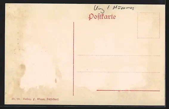 Personenbezogene Daten auf der Rückseite der Karte wurden durch blauen Textmarker unkenntlich gemacht. Die blauen Stellen sind auf die Vorderseite durchgeweicht und wirken sich negativ auf das Postkartenfoto aus