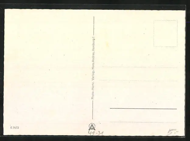 Personenbezogene Daten auf der Rückseite der Karte wurden durch blauen Textmarker unkenntlich gemacht. Die blauen Stellen sind auf die Vorderseite durchgeweicht und wirken sich negativ auf das Postkartenfoto aus
