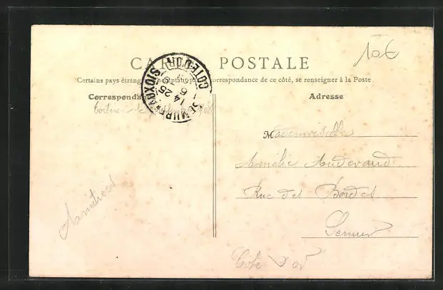 Personenbezogene Daten auf der Rückseite der Karte wurden durch blauen Textmarker unkenntlich gemacht. Die blauen Stellen sind auf die Vorderseite durchgeweicht und wirken sich negativ auf das Postkartenfoto aus
