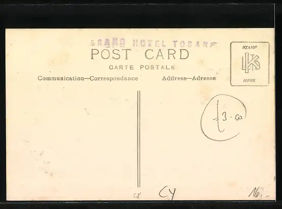 Personenbezogene Daten auf der Rückseite der Karte wurden durch blauen Textmarker unkenntlich gemacht. Die blauen Stellen sind auf die Vorderseite durchgeweicht und wirken sich negativ auf das Postkartenfoto aus