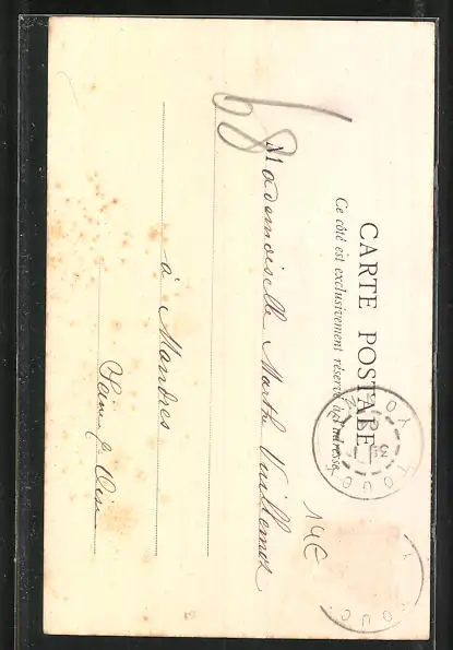 Personenbezogene Daten auf der Rückseite der Karte wurden durch blauen Textmarker unkenntlich gemacht. Die blauen Stellen sind auf die Vorderseite durchgeweicht und wirken sich negativ auf das Postkartenfoto aus