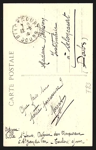Personenbezogene Daten auf der Rückseite der Karte wurden durch blauen Textmarker unkenntlich gemacht. Die blauen Stellen sind auf die Vorderseite durchgeweicht und wirken sich negativ auf das Postkartenfoto aus
