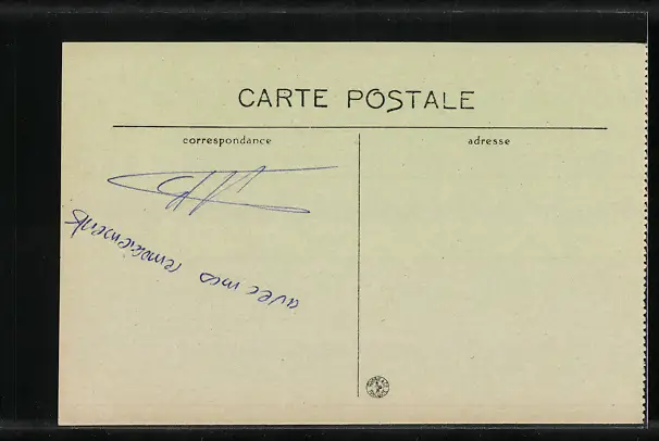 Personenbezogene Daten auf der Rückseite der Karte wurden durch blauen Textmarker unkenntlich gemacht. Die blauen Stellen sind auf die Vorderseite durchgeweicht und wirken sich negativ auf das Postkartenfoto aus