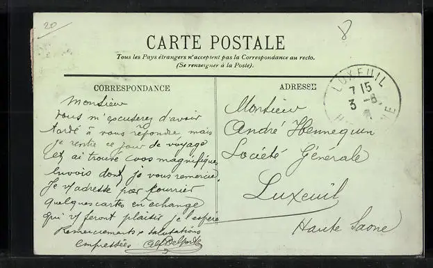 Personenbezogene Daten auf der Rückseite der Karte wurden durch blauen Textmarker unkenntlich gemacht. Die blauen Stellen sind auf die Vorderseite durchgeweicht und wirken sich negativ auf das Postkartenfoto aus