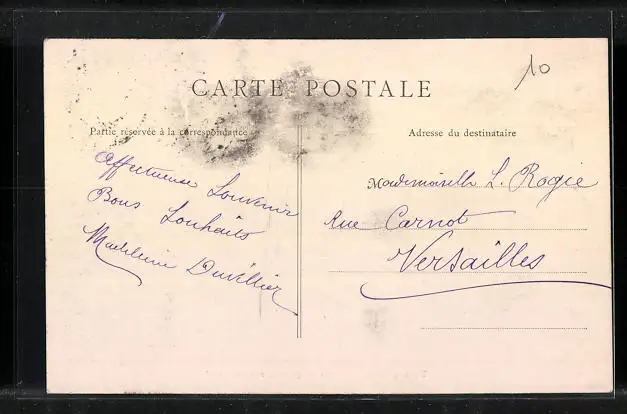 Personenbezogene Daten auf der Rückseite der Karte wurden durch blauen Textmarker unkenntlich gemacht. Die blauen Stellen sind auf die Vorderseite durchgeweicht und wirken sich negativ auf das Postkartenfoto aus