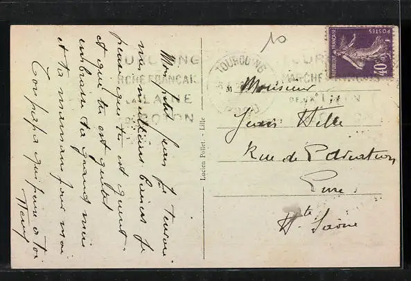 Personenbezogene Daten auf der Rückseite der Karte wurden durch blauen Textmarker unkenntlich gemacht. Die blauen Stellen sind auf die Vorderseite durchgeweicht und wirken sich negativ auf das Postkartenfoto aus