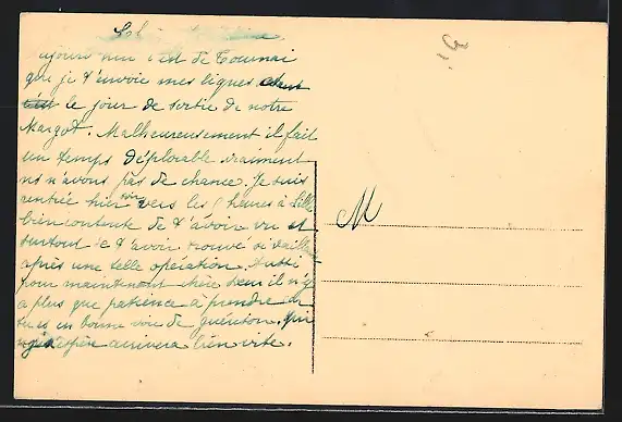 Personenbezogene Daten auf der Rückseite der Karte wurden durch blauen Textmarker unkenntlich gemacht. Die blauen Stellen sind auf die Vorderseite durchgeweicht und wirken sich negativ auf das Postkartenfoto aus