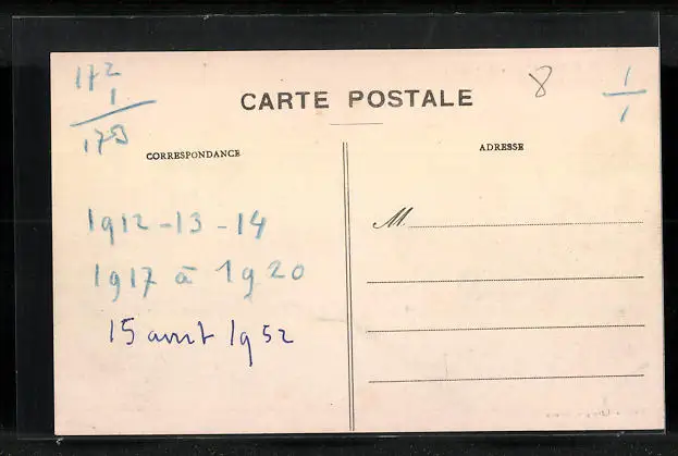 Personenbezogene Daten auf der Rückseite der Karte wurden durch blauen Textmarker unkenntlich gemacht. Die blauen Stellen sind auf die Vorderseite durchgeweicht und wirken sich negativ auf das Postkartenfoto aus
