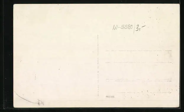 Personenbezogene Daten auf der Rückseite der Karte wurden durch blauen Textmarker unkenntlich gemacht. Die blauen Stellen sind auf die Vorderseite durchgeweicht und wirken sich negativ auf das Postkartenfoto aus