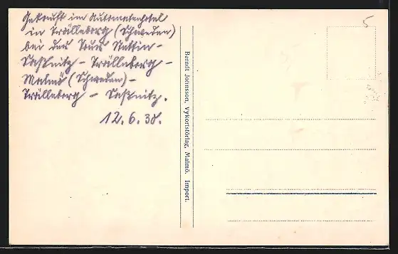 Personenbezogene Daten auf der Rückseite der Karte wurden durch blauen Textmarker unkenntlich gemacht. Die blauen Stellen sind auf die Vorderseite durchgeweicht und wirken sich negativ auf das Postkartenfoto aus