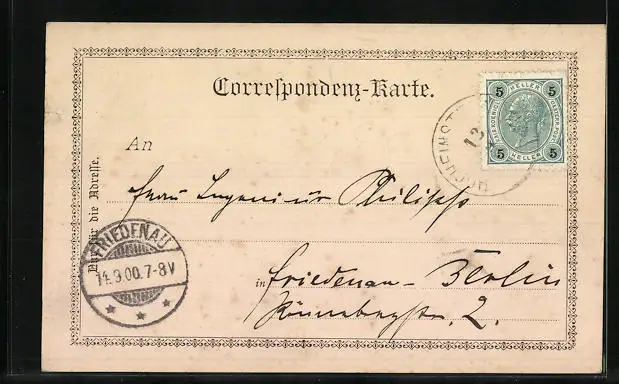 alte Ansichtskarte, gelaufen 1900, Einriss re. oben, guter Zustand