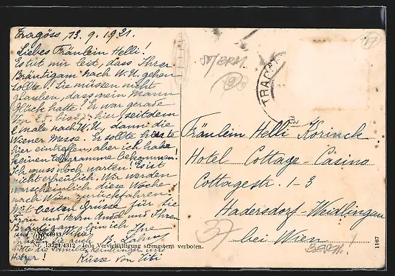 alte Ansichtskarte, gelaufen 1921, Briefmarke entfernt, rückseitig Oberflächenschaden, guter Zustand