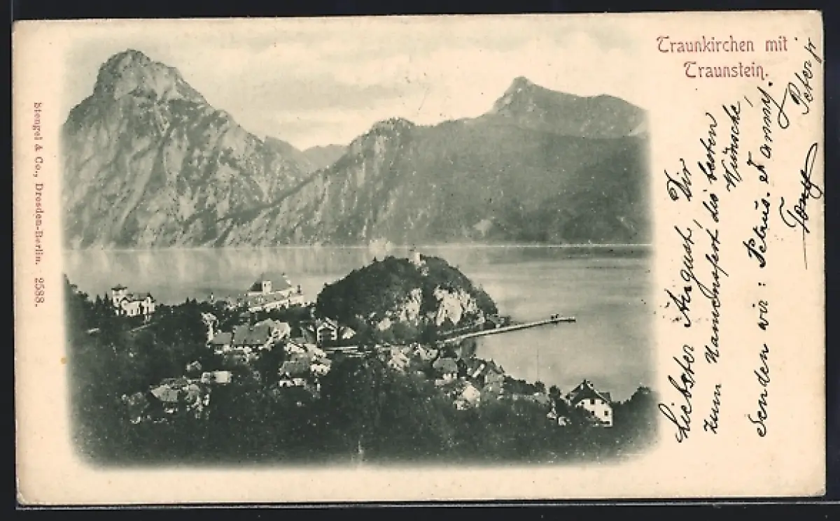AK Traunkirchen, Ortsansicht am Ufer mit Traunstein