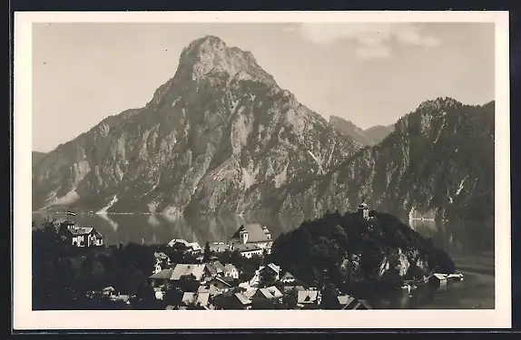 AK Traunkirchen, Ortsansicht mit den Bergen dahinter