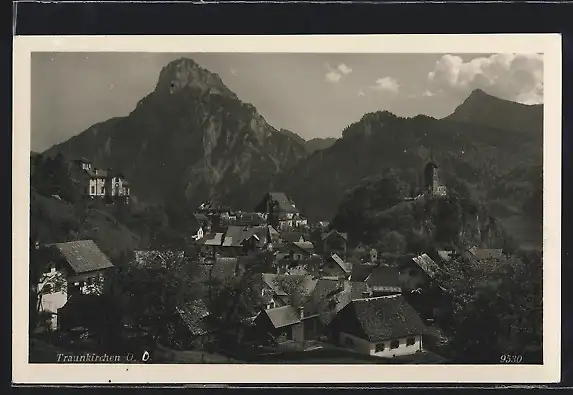 AK Traunkirchen a. D., Totalansicht mit Bergpanorama aus der Vogelschau