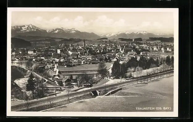 AK Traunstein /Obb., Ortsansicht mit Bahnschienen aus der Vogelschau