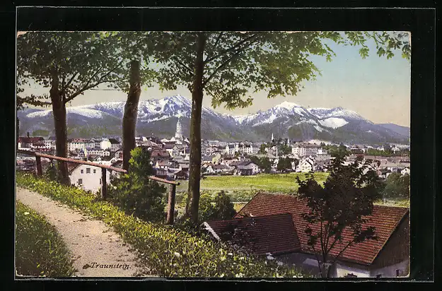 AK Traunstein, Ortsansicht mit Kirche und Gebirgspanorama