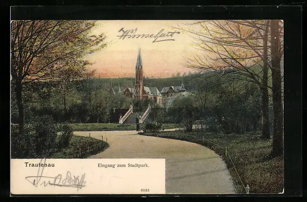 AK Trautenau, Eingang zum Stadtpark mit Kirche
