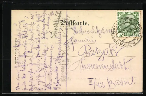 Personenbezogene Daten auf der Rückseite der Karte wurden durch blauen Textmarker unkenntlich gemacht. Die blauen Stellen sind auf die Vorderseite durchgeweicht und wirken sich negativ auf das Postkartenfoto aus