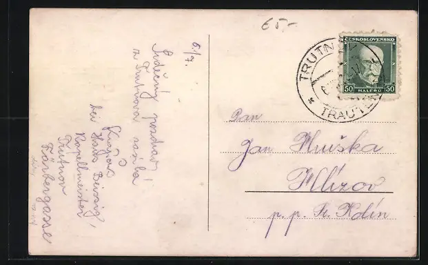 Personenbezogene Daten auf der Rückseite der Karte wurden durch blauen Textmarker unkenntlich gemacht. Die blauen Stellen sind auf die Vorderseite durchgeweicht und wirken sich negativ auf das Postkartenfoto aus