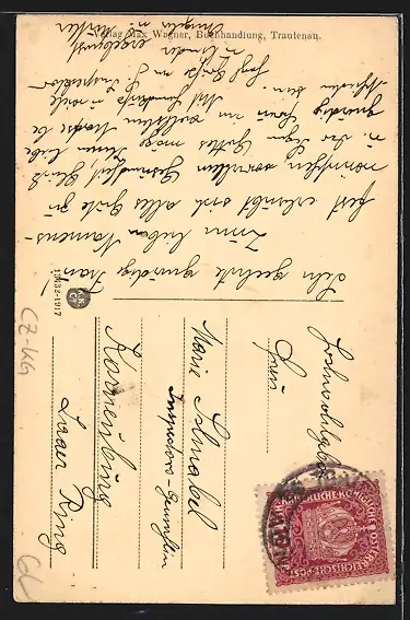 Personenbezogene Daten auf der Rückseite der Karte wurden durch blauen Textmarker unkenntlich gemacht. Die blauen Stellen sind auf die Vorderseite durchgeweicht und wirken sich negativ auf das Postkartenfoto aus
