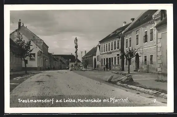 AK Trautmannsdorf a. d. Leitha, Mariensäule mit Pfarrhof