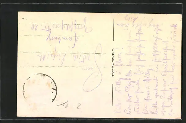 Personenbezogene Daten auf der Rückseite der Karte wurden durch blauen Textmarker unkenntlich gemacht. Die blauen Stellen sind auf die Vorderseite durchgeweicht und wirken sich negativ auf das Postkartenfoto aus