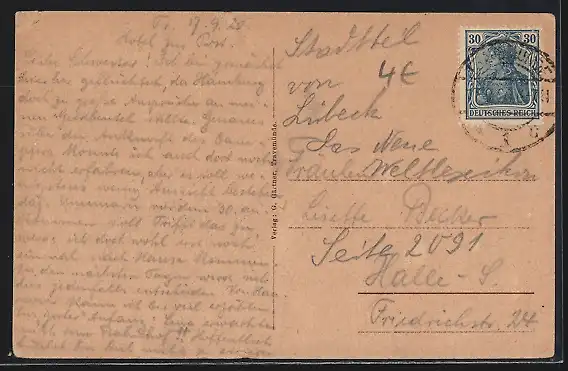 alte Ansichtskarte, gelaufen 1920, Eckknicke oben, minimaler Einriss re. oben, guter Zustand