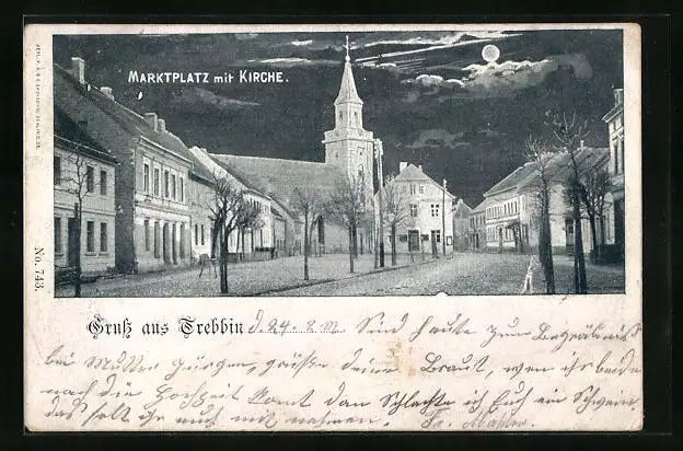 AK Trebbin, Marktplatz mit Kirche bei Mondschein